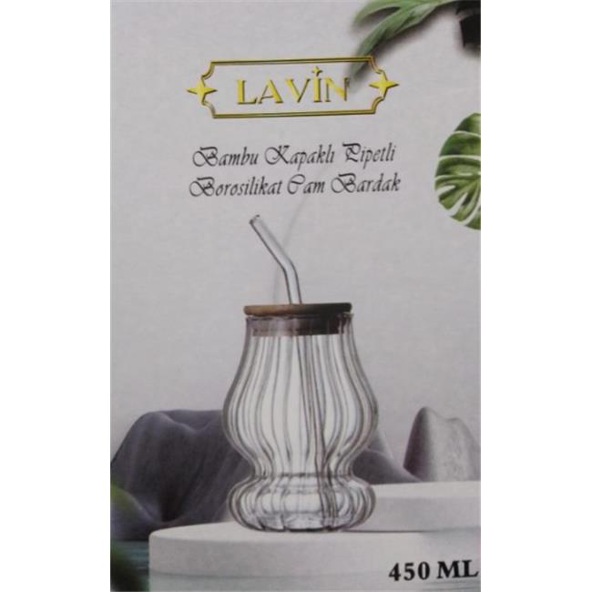 Lavin 47227 Bambu Kapaklı Pipetli Borosilikat Cam Bardak 450ml