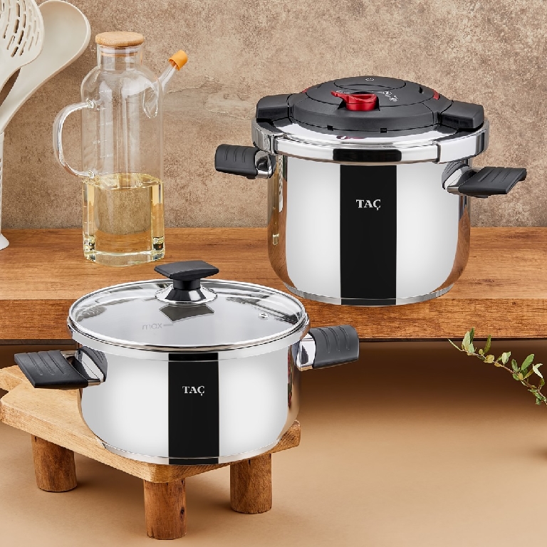 Taç VitaMaster 4+6 Litre Düdüklü Tencere Seti 18/10 paslanmaz çelik İndüksiyon dahil tüm ocaklarda kullanıma uygun enerji kapsül taban. Yanmayan ve ısınmayan bakalit yan saplar. 4 ve 6 litreden oluşan 2 farklı gövde. 2 tencere de kullanılabilen düdüklü kapak. 2 tencere de kullanılabilen cam kapak. 2 tencereye de uyumlu kullanılabilecek gibi tasarlanmış düdüklü kapak ve cam kapak sayesinde 2 farklı düdüklü ve 2 farklı tencere olarak kullanılabilir. Düdüklü kapak hariç olarak diğer parçalar bulaşık makinesinde yıkanmaya uygundur.